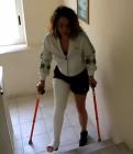 Thirty days after her injury, Diana is in bed wearing a top that accentuates her big breasts and black panties contrasting with the enormous white cast immobilizing her broken leg. She must make her way down the stairs to the kitchen. You see her terribly struggles descending the steps, leaning on her ass and bracing herself with her wrists. Once she reaches the lower floor, Diana crutched to the kitchen to prepare a herbal tea, showing you her round ass subframed by the cast. She then arouses you with erotic close-ups of her scratching the itch inside the cast with a wooden spoon and massaging her groin, which is sore from the edge of the cast rubbing against her skin. Then, poor Diana has to climb back up the stairs to her bedroom, and she'll do so while you admire her from right under her cast, almost as if you were holding her toes in your mouth.