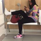 Twenty days after her accident, Diana is out again with her friend Svitlana, spending a cold, rainy day at the mall. Svitlana pushes her poor, injured friend in her wheelchair for a long time, while Diana appears in pain and discomfort, her cast leg stretched out in front of her on the wheelchair's supports, her toes covered by a conspicuous, warm sock. You'll see the gazes and attention of passersby focused on Diana's casted leg during the long minutes they spend wandering through the shop windows before reaching a fast food restaurant. Here, from the perspective of a neighbor at a table, you'll see the two friends ordering and then enjoying their meal, with Diana's broken foot, finally free from the sock, casually displayed next to the table.