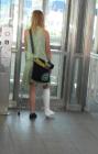 Hannah then demonstrates her crutch skills, acquired since she first wore her medical short leg cast, by performing a long walk on crutches at the sports park. Dressed in a top and shorts that reveal her heavy cast, she moves with underarm crutches, showing heaviness and pain at every step.