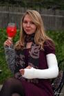 On her back from the restaurant, Svitlana takes the time to show you the garden of the B&B home where she's staying, Always moving elegantly and with her cast covered by the sleeve of the sweater. Then you'll share a drink and dessert with her, and she, sitting in front of you, will show you how she's started to move her hand better and will satisfy your desire to see her entire casted arm by removing the sweater and showing you how high to her armpit the cast extends.