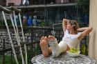 Svitlana is on the panoramic terrace of her house with her lower leg casted after injuring herself doing step aerobics at the gym. Dressed in summer clothes, she's relaxing, resting her broken ankle high on the coffee table, offering you sensual close-ups of her toes sticking out of the cast. Her friend Larissa visits her, comforting her and easing the situation by telling her that the cast is small and won't cause her too much discomfort. Svitlana feels a bit mocked but doesn't show it. Karma, however, turns against Larissa, who trips down the stairs and ends up screaming in pain with her leg unnaturally bent.
