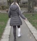 Lia and her friend are driving home after she has gotten cast applied with nylon hose over it to to protect her cold toes. However, when they have car trouble, Lia and her friend must crutch home the few blocks to her apartment. It's a problem because Lia has not gotten used to her crutches and they are bothering her underarms. It doesn't help that there are autumn leaves strewn all over the street making it difficult to crutch. So she and her friend stop when they find a bench so that her friend can massage her cold exposed toes through her nylons. Then they continue on where Lia must deal with another challenge -- crutching up the stairs to her walk up apartment. It's clear Lia is struggling throughout the clip.
