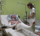 We offers clips of crutching and hopping, leg cast and sprained ankle with models from Europe.