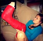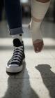 Content featuring cast, crutches and neck brace.