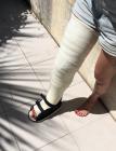 (English) After Alecia finds herself stranded in the park her friend arrives with a cast shoe to help her get around in her new leg cast. But her toes are still frozen and her friends agrees to massage them and blow some hot air to warm them up for which Alecia is very grateful. Then they crutch to her friend's for the drive home. When she arrives poor Alecia must crutch up a bunch of stair cases before crutching all the way back down to do some more errands in her new open cast sandal.