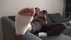 (English) Carolina struggles up multiple staircases on her bad foot, her toes sticking out of her cast shoe as she visits the doctor's office for a checkup of her sprain. As she rubs her exposed foot in the waiting room Dorothy is struggling up the stairs in the same half shoe for her appointment. When she gets to the waiting room both women are surprised to see they are stuck in the same footwear as they compare their sprained feet. When Dorothy touches Carolina's foot she winces and they both decide to help each other out by massaging each others feet in their half shoes. An excellent must see foot massage clip.