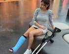 (English) Viktoria is home nursing her casted leg and talking to her friend on the phone about her casting experience as she hangs out on the couch. She also tries to hop around and clean up her apartment but the restrictive cast is bothering her toes particularly her large big toe which don't have enough room sticking out of the opening. So she needs to continue to rub them. Finally after trying to get comfortable she crutches out of the apartment.